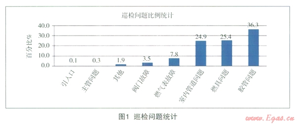 北京市燃氣集團從2007年5月開始進行第一期全面巡檢,每期持續(xù)l8個月,至今已進行2.5期巡檢,居民戶內(nèi)安全巡檢內(nèi)容包括:戶內(nèi)燃氣管道和戶內(nèi)燃氣設備的安裝情況是否符合規(guī)范、外觀狀況如何、設備是否正常、是否有泄漏等。如果發(fā)現(xiàn)異常,能現(xiàn)場維修事項進行維修,不能現(xiàn)場維修事項實施維修工作程序,或者啟動緊急搶修程序,或者向用戶發(fā)放“居民用戶巡檢告知單”。本文取第二期(自2008年12月至2010年4月)安全巡檢數(shù)據(jù)進行分析。第二期巡檢入戶率約為53.31%,其問題統(tǒng)計1如圖l所示。