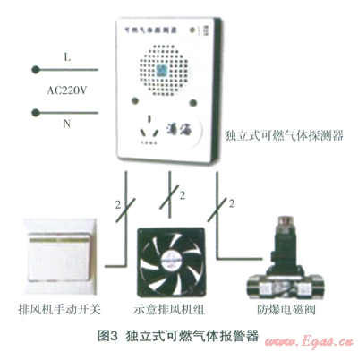 單一報警功能的報警器:它能在傳感器周圍燃氣濃度達到一定數(shù)值時嗚叫或者發(fā)光報警,提示家庭用戶及時采取措施。這種報警器的特點是價格較低,安裝簡便,無需改造燃氣系統(tǒng),因此適用于老舊小區(qū)。另一類為帶信號輸出功能的報警器,如圖3所示。這種報警器可以驅(qū)動電磁閥在報警的同時及時切斷燃氣通道,或者控制排風扇、抽油炯機強制排風,但其安裝相對復雜。