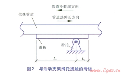 與活動(dòng)支架滑托接觸的滑板見(jiàn)圖2?;惺庆o止的,滑板與管道焊接在一起,滑板隨管道的熱脹冷縮一起運(yùn)動(dòng)。對(duì)于旋轉(zhuǎn)補(bǔ)償器設(shè)置在靠近一側(cè)固定支架的管段(見(jiàn)圖3),每個(gè)活動(dòng)支架處管道的熱伸長(zhǎng)量、冷收縮量均不一致,越接近旋轉(zhuǎn)補(bǔ)償器的管道兩種位移量越大,這使得每個(gè)活動(dòng)支架處的滑板設(shè)計(jì)長(zhǎng)度均不同。由于滑板越短,造價(jià)越低,熱損失越小,因此在滿足管道位移量的前提下(即不使得滑板脫離滑托),滑板越短越好。