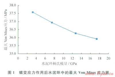 在以往關(guān)于蠕變地應(yīng)力對封固系統(tǒng)受力狀態(tài)影響的研究中,建立的封固系統(tǒng)模型通常包括套管、水泥環(huán)和地層3個部分,將蠕變地應(yīng)力施加于地層外側(cè)[19-20]。工程實際中,蠕變地應(yīng)力最終直接作用于水泥環(huán)上[15],與上述建立的模型有所差別。本研究根據(jù)工程實際情況,建立的封固系統(tǒng)模型只包括套管和水泥環(huán)兩部分,將蠕變地應(yīng)力直接施加于水泥環(huán)外側(cè)。井眼直徑取為215.9mm,套管內(nèi)外徑分別取為l57.1mm和177.8mm,套管楊氏模量及泊松比分別取為210GPa和0.26,水泥環(huán)泊松比取為0.19,變化水泥環(huán)楊氏模量分別為3.32GPa(水泥漿密囊1.57g/cm3,無圍壓,抗壓強度16.4MPa)、7.49GPa(水泥漿密度1.79g/cm3,無圍壓,抗壓強度21.2MPa)、l2.73GPa(水泥漿密度1.85g/cm3,圍壓5MPa,抗壓強度27.1MPa)、17.45GPa(水泥漿密度1.9g/cm3,圍壓20MPa,抗壓強度34.3MPa)。一界面和二界面處的初始擠壓應(yīng)力分別設(shè)為2MPa和3MPa,蠕變地應(yīng)力取為40MPa。利用ANSYS軟件建模和計算封同系統(tǒng)中的應(yīng)力,選擇Von Mises準則汁算得到水泥環(huán)中的最大應(yīng)力(位于水泥環(huán)內(nèi)側(cè))(圖1)。