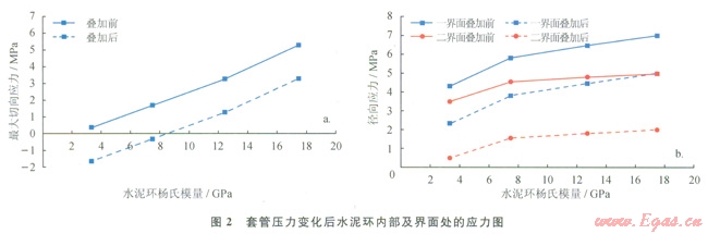 由圖4-a圖看出,水泥環(huán)內(nèi)的最大Von Miscs應(yīng)力隨水泥環(huán)楊氏模量的增大而增大;與初始應(yīng)力替加后,Von Mises應(yīng)力增大為4.4~8.0MPa,小于普通水泥環(huán)的屈服強度。所以,當溫度變化幅度不大時,水泥環(huán)通常不會發(fā)生屈服破壞,但溫度升高幅度較大時水泥環(huán)可能會發(fā)生屈服破壞。因此,對熱采井等應(yīng)避免使用膨脹水泥漿,且應(yīng)使用低楊氏模量的水泥環(huán)。由圖4-b可以看出,與初始應(yīng)力疊加前,一、二界面在徑向上受拉伸應(yīng)力的作用且應(yīng)力隨水泥環(huán)的楊氏模量增大而增大,為4.4~8.0MPa,遠大于一、二界面膠結(jié)的抗拉強度,會破壞一、二界面膠結(jié);與初始應(yīng)力疊加后,徑向應(yīng)力顯著降低至1.4~6.0MPa,降低了一、二界面膠結(jié)破壞的風險。因此,通過降低水泥環(huán)楊氏模量和增大初始應(yīng)力都可以降低界面膠結(jié)破壞的風險,建議采用較低楊氏模量的水泥環(huán)或使用膨脹水泥來預(yù)防失效。