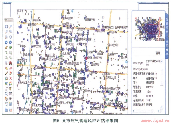 (4)實(shí)現(xiàn)燃?xì)夤艿里L(fēng)險(xiǎn)水平的可視化。首先得到該市的燃?xì)夤艿赖臇鸥駡D像,經(jīng)轉(zhuǎn)換成矢量數(shù)據(jù)并作適當(dāng)處理后存入supermap deskpro。將燃?xì)夤艿赖幕拘畔⒓帮L(fēng)險(xiǎn)水平等相關(guān)數(shù)據(jù)導(dǎo)入supermap deskpro,再使用supermap is.net將相關(guān)數(shù)據(jù)顯示出來,可以使用查詢條件查詢?nèi)細(xì)夤艿赖幕拘畔⒓捌滹L(fēng)險(xiǎn)水平,這樣可以通過圖得知各段管道的風(fēng)險(xiǎn)情況并及時(shí)采取相應(yīng)的措施。查詢結(jié)果如圖6所示。