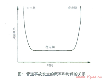 按照W.KentMuhlbauer的分類方法,造成管道失效和事故的原因共4大類:①第三方破壞。第三方破壞原因是指燃?xì)夤艿酪蜃钚÷裆睢⒌孛嫔系幕顒?dòng)狀況(水平)、當(dāng)?shù)鼐用竦乃刭|(zhì)(公眾教育)、管道地上設(shè)備安全、線路狀況、巡線頻率等因素,這些因素以外力擠壓或人為破壞的形式使燃?xì)夤艿朗艿綋p壞。②管道腐蝕。腐蝕是導(dǎo)致燃?xì)夤艿?span lang="EN-US">(主要是鋼管)穿孔、破裂的重要破壞因素。對(duì)于埋地管道而言,腐蝕來自兩個(gè)方面:內(nèi)腐蝕和外腐蝕。③人工誤操作。人工誤操作包括設(shè)計(jì)誤操作、施工誤操作、技術(shù)誤操作、管理與監(jiān)督誤操作、運(yùn)行維護(hù)與檢測(cè)誤操作等,這些誤操作會(huì)導(dǎo)致燃?xì)夤芫W(wǎng)運(yùn)行的安全性降低,風(fēng)險(xiǎn)增加。④管網(wǎng)設(shè)計(jì)。設(shè)計(jì)需考慮的因素有管道最大承受壓力、管內(nèi)水擊因素、設(shè)計(jì)厚度和選材選型、士層移動(dòng)、線路選擇、施工方案等,考慮不周會(huì)導(dǎo)致燃?xì)馐鹿实陌l(fā)生。在實(shí)際風(fēng)險(xiǎn)管理中,用普通的概率計(jì)算方法計(jì)算其風(fēng)險(xiǎn)概率相當(dāng)困難,有些還不可能實(shí)現(xiàn)。因此,采用美國核管理委員會(huì)(NUREG)推薦的方法,通過計(jì)算失效速率得出風(fēng)險(xiǎn)概率。由分析統(tǒng)計(jì)的相關(guān)資料可知,管道發(fā)生事故的風(fēng)險(xiǎn)概率一般符合U型曲線(見圖l),即初期處于磨合階段,管道工作并不穩(wěn)定,后期接近設(shè)計(jì)壽命,事故發(fā)生也較頻繁。若只考慮中間的穩(wěn)定期,則其風(fēng)險(xiǎn)速率v可視為常數(shù)。
