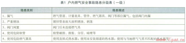 以筆者所在單位為例,目前將戶內(nèi)燃氣安全隱患分為三級,一級隱患風險等級最高,共5類,如表l所示。