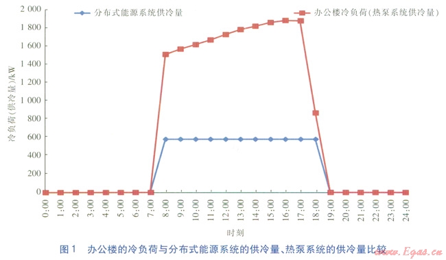 辦公樓在供冷期白天工作時(shí)段(8:00—18:00)的平均冷負(fù)荷為1650kW,最大冷負(fù)荷為1879kW,最小冷負(fù)荷為869kW。夜間冷負(fù)荷按0kW估算。辦公樓的冷負(fù)荷與分布式能源系統(tǒng)的供冷量、熱泵系統(tǒng)的供冷量比較見(jiàn)圖1(熱泵系統(tǒng)的供冷量與冷負(fù)荷一致)。