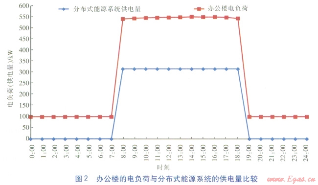 辦公樓白天工作時(shí)段(8:00—18:00)的平均電負(fù)荷(不包括制冷用電負(fù)荷)為546kW,非工作時(shí)間內(nèi)電負(fù)荷均按照100kW估算,辦公樓的電負(fù)荷與分布式能源系統(tǒng)的供電量比較見(jiàn)圖2。