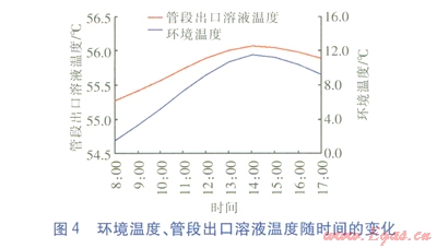 其他條件不變,采用長沙典型年1月1日8:00—17:00的逐時室外干球溫度作為環(huán)境溫度,對管段0-4出口溶液溫度進行仿真計算。環(huán)境溫度、管段出Vl溶液溫度隨時間的變化見圖4。由圖4可知,計算工況下,環(huán)境溫度從最低(1.5℃)升至最高(11.5℃),管段0-4出口溶液溫度由55.27℃升至56.07℃。