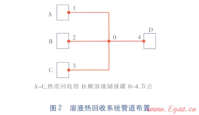 某溶液熱回收系統(tǒng)管道布置見圖2,溶液分別從熱質(zhì)回收塔A、B、C吸收熱量后在節(jié)點0匯合,進入稀溶液儲液罐D。