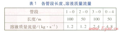 各管段長度、溶液質(zhì)量流量見表1。設(shè)定節(jié)點1~3處溶液溫度均為60℃,管段1-0、2-0、3-0溶液質(zhì)量分數(shù)分別為41%、38%、41%,環(huán)境溫度為5℃,各管段單位長度散熱系數(shù)均取2W/(m·K)。
