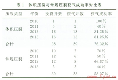 38口體積壓裂井有29口井獲氣,獲氣成功率為76.32%;39口常規(guī)壓裂井有23口井獲氣、獲氣成功率為58.97%(表1)。