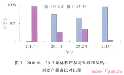 2010年—2013年蜀南氣礦在川南地區(qū)加砂壓裂鉆井累計(jì)測試產(chǎn)量732.49×104m3/d:其中體積壓裂獲取測試產(chǎn)量497.63×104m3/d,占比67.94%,常規(guī)壓裂獲取測試產(chǎn)量234.86×104m3/d,占比32.06%。在此期間,2010年測試產(chǎn)量39.82×104m3/d:其中體積壓裂1.08×104m3/d,占比2.79%,常規(guī)壓裂38.74×104m3/d,占比97.21%;2011年測試產(chǎn)量48.24×104m3/d:其中體積壓裂35.41×104m3/d,占比73.4%,常規(guī)壓裂12.83×104m3/d,占比26.6%;2012年測試產(chǎn)量498.89×104m3/d:其中體積壓裂322.52×104m3/d,占比64.65%,常規(guī)壓裂176.37×104m3/d,占比35.35%;2013年測試產(chǎn)量145.54×104m3/d:其中體積壓裂138.62×104m3/d,占比95.25%,常規(guī)壓裂6.92×104m3/d,占比4.75%,體積壓裂測試產(chǎn)量占比呈上升趨勢(shì)(圖3)。
