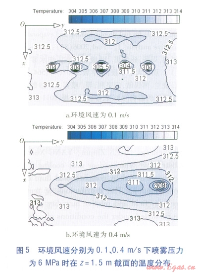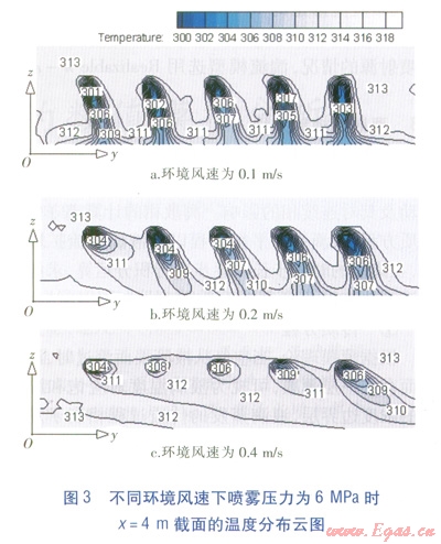 模擬結(jié)果顯示,在相同環(huán)境風速下,3種噴霧壓力的降溫范圍與降溫幅度沒有明顯差別,說明在模擬的噴霧壓力范圍內(nèi),噴霧壓力對降溫效果的影響很小,不如環(huán)境風速對降溫效果的影響明顯。