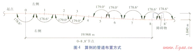 由圖4可知,在節(jié)點(diǎn)0位置管段0—1向右側(cè)偏轉(zhuǎn)1.4°,管段1—2、2—3、3—4繼續(xù)向右側(cè)偏轉(zhuǎn),管段4—5不再偏轉(zhuǎn)(即節(jié)點(diǎn)4的折角為0)。隨即,管段5—6向左側(cè)偏轉(zhuǎn)1.0°,管段6—7、7—8、8—8¢繼續(xù)向左側(cè)偏轉(zhuǎn),管段8—8¢為障礙物所在位置并與管道初始方向平行。采取以上布置方式,沿管道初始方向行進(jìn)19.968m后,整體向右側(cè)偏移1.040m,繞過(guò)障礙物(即管段8—8¢所在位置)后,繼續(xù)行進(jìn)19.968m重新回到原管位。求解過(guò)程中,管段最短長(zhǎng)度為2m,最大實(shí)際折角為1.4°,滿足限制條件。