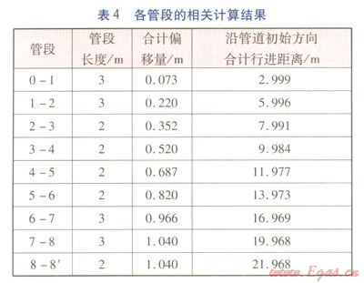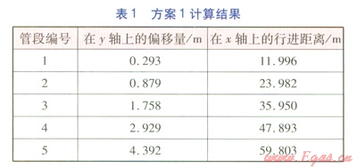 由表1、2可知,若實(shí)現(xiàn)0.879m的y軸上的偏移量,方案2在x軸上僅行進(jìn)17.975m,而方案1需行進(jìn)23.982m。這說(shuō)明,采取縮短管段長(zhǎng)度的方法,有利于在較短的行進(jìn)距離內(nèi)實(shí)現(xiàn)較大的偏移量,從而順利避開(kāi)障礙物。需要指出的是:在實(shí)際工程中,我們可以采取多實(shí)際折角與多管段長(zhǎng)度相結(jié)合的處理方法,但焊縫數(shù)量不宜過(guò)多,以影響施工質(zhì)量。不應(yīng)出現(xiàn)避讓開(kāi)障礙物后,管道調(diào)整回原管位時(shí)出現(xiàn)實(shí)際折角大于最大允許折角的情況。