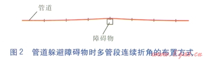 在直埋供熱管道的實(shí)際設(shè)計(jì)與施工中經(jīng)常遇到設(shè)計(jì)路由上有障礙物且無(wú)法移走的情況,因此管道必須局部改變方向(包括水平面、豎直面上的方向改變),避讓障礙物,通過(guò)后還需調(diào)整回原路由。由于現(xiàn)場(chǎng)這樣的情況非常多,因此若每遇到這種情況都采用預(yù)制彎管,一方面需要增加大量的預(yù)制彎管數(shù)量,使工程造價(jià)提高;另一方面,定制預(yù)制彎管的時(shí)間很長(zhǎng),延長(zhǎng)了工期,這往往是不可行的。因此,實(shí)際工程中常采用多管段連續(xù)折角的方法處理。管躲避障礙物時(shí)多管段連續(xù)折角的布置方式見(jiàn)圖2。