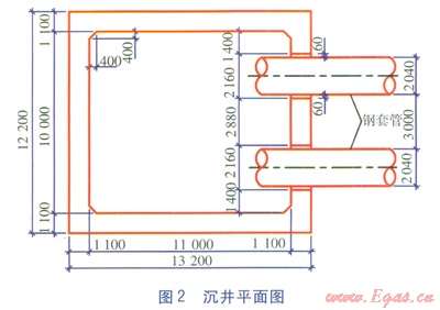 由式(6)可計(jì)算得,工作井長(zhǎng)度L為11m。工作井采用沉井法施工,沉井常見形式有圓形沉井、矩形沉井、腰圓形沉井、多邊形沉井等。其中矩形沉井底部平面布置靈活,利用率較高,且提供的后背反力比同規(guī)模的圓形沉井大,而且矩形沉井制作方便,施工模板可多次重復(fù)使用。由于該工程需頂進(jìn)平行的兩根鋼套管,所需后背反力較大,最終選取矩形沉井。沉井平面圖見圖2,圖中數(shù)值單位為mm。矩形沉井內(nèi)尺寸(長(zhǎng)×寬)為11.0m×10.0m,沉井壁厚為1.1m,下部底板附近的沉井壁厚增至1.2m。