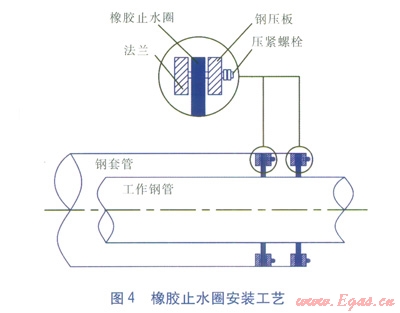 頂管結(jié)束后,在鋼套管端口焊接法蘭,用鋼壓板壓上兩道橡膠止水圈,封堵鋼套管與供熱管道之間的透水通道(見圖4)。并在鋼套管出口設(shè)置黏土截滲環(huán)(見圖l),黏土截滲環(huán)厚15m,其中7.5m包裹鋼套管,7.5m包裹出口供熱管道。