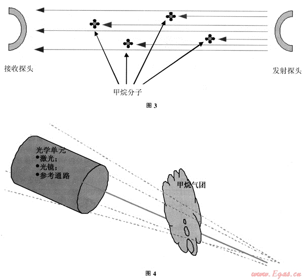 SELMA發(fā)射激光束(1.65μm-近紅外光):激光遇到物體后,漫反射光被光學(xué)單元內(nèi)的拋物柱面鏡所收集,當(dāng)激光遇到甲烷氣團(tuán)。激光的能量被甲烷氣團(tuán)吸收成為甲烷氣團(tuán)的能量組成部分;較少的激光被反射回光學(xué)單元,使接收到的激光信號(hào)減弱;這種減弱會(huì)被專用軟件所處理。利用激光對(duì)甲烷具有極好的選擇性,收集激光在甲烷氣團(tuán)中的散射光,通過(guò)軟件的算法,實(shí)現(xiàn)甲烷的濃度峰值的計(jì)算,同時(shí)避免了其它碳?xì)浠衔锏母蓴_。如汽車(chē)尾氣等。見(jiàn)圖4。