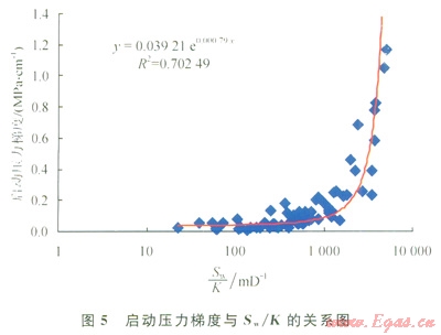 巖石孔隙介質(zhì)中,由于氣水潤濕性的差異和毛細管壓力的作用,水優(yōu)先占據(jù)小孔喉和孔隙壁面,并且由于氣體的易壓縮性,其在含水的孔隙中流動時,首先選擇大的孔隙,隨著流動壓差的增大,逐漸驅(qū)動小一些吼道的水或使孔隙壁面的水膜變薄,在未形成連續(xù)氣流的孔喉處氣體前沿呈跳躍式前行,且容易被水卡斷[17],這就是氣體在含水孔隙介質(zhì)中流動存在啟動壓力梯度的微觀機理。表現(xiàn)在滲流曲線上,流量與壓差并不呈線性關系,通過數(shù)據(jù)擬合可以求出不同含水飽和度時的啟動壓力,除以巖樣長度即為啟動壓力梯度,將全部巖樣的實驗數(shù)據(jù)繪于同一圖上(圖4),發(fā)現(xiàn)啟動壓力梯度隨含水飽和度增大而增大,且?guī)r樣滲透率越小,這種趨勢越明顯,當含水飽和度大于50%以后,啟動壓力梯度明顯增大。進一步通過數(shù)據(jù)分析發(fā)現(xiàn),啟動壓力梯度與含水飽和度和滲透率的比值(Sw/K)具有很好的相關性(圖5),呈以下的指數(shù)函數(shù)關系: