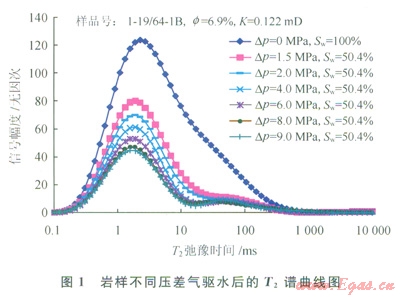 經(jīng)過成藏作用后,巖石孔隙中各類孔、喉中均有水的賦存,其賦存狀態(tài)受控于孔喉大小、形狀以及巖石表面物理性質(zhì)等[12],對于氣藏儲層來說,一般在細小孔喉處賦存的水較多。通過巖樣飽和水后進行氣驅(qū)水和核磁共振實驗,分析了登婁庫組巖石中水的賦存特征。巖樣含水飽和度為100%時測試的核磁共振T2譜曲線反映的是孔隙內(nèi)全部水體積,曲線下包面積代表了巖樣的全部孔隙體積。在不同壓差氣驅(qū)水后(氣驅(qū)水過程的驅(qū)替壓差由小到大逐步增加),巖樣達到不同含水飽和度,隨著氣驅(qū)壓差的增大,巖樣含水飽和度降低,T2譜曲線下降(圖1),相鄰T2譜曲線之間的面積代表了兩條曲線對應驅(qū)替壓力變化所引起的可動流體變化量,因此由相鄰T2譜曲線之間的面積分布及大小可看出可動水來自哪些孔隙及總量多少[13]。