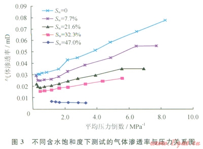 前人研究表明[14-16],致密砂巖中由于復雜的孔隙結(jié)構(gòu),氣體滲流存在非達西特征。筆者通過氣驅(qū)水實驗分析表明,當驅(qū)替壓差較小時,氣體不能驅(qū)動水形成流動,只有當驅(qū)替壓差大于某一臨界值,足以克服水鎖產(chǎn)生的毛細管阻力才能發(fā)生流動,這在滲流曲線上表現(xiàn)為啟動壓差。對同一巖樣,其含水飽和度越高,氣體始流動所需的驅(qū)動壓差越大,氣體開始流動后,驅(qū)替壓差越大流量越大;巖樣含水飽和度越低,相同驅(qū)替壓差下流量越大。但是,壓差增大滲透率不一定變大,當巖樣含水飽和度較高時,隨著驅(qū)替壓差的增大(平均壓力倒數(shù)減小),氣體滲透率有的增加,有的減?。划攷r樣含水飽和度較低時,隨著驅(qū)替壓差的增大(平均壓力倒數(shù)減小),氣體滲透率普遍呈先降低后增加的特點,這是因為前期主要受滑脫效應的影響,而后期,當平均壓力倒數(shù)低于一定程度后(即驅(qū)替壓差大于一定值后),這時氣體帶動部分孔隙中的水流動,或使孔隙壁的水膜變薄,氣體滲流通道增加。因此氣體滲透率開始增加(圖3)。含水飽和度越高,這種水的可動性對氣體滲流的影響越明顯。