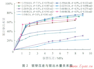 圖2是不同物性巖樣的實驗結(jié)果,由于巖樣初始狀態(tài)為完全含水,含水飽和度在氣驅(qū)壓力起始點下降較大(累計驅(qū)出水量大),隨著氣驅(qū)壓力增加,含水飽和度下降幅度減小。不同壓差氣驅(qū)后含水飽和度下降幅度受孔隙度影響大,孔隙度大的巖樣含水飽和度最終下降幅度一般較大,而孔隙度相近的巖樣,滲透率小的飽和度最終下降幅度則小。