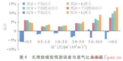 無(wú)滑脫模型各項(xiàng)誤差次之(圖4),組分模型計(jì)算誤差大于黑油模型,是由于Govier-Fogarasi用的凝析氣井液氣比為0.05~14.4m3/104m3,從黑油模型對(duì)所選模型(無(wú)滑脫、Gray和Hagedorn&Brown沒(méi)有劃分流型)計(jì)算流型看:Mukherjee&Brill和Orkiszewski所有井井簡(jiǎn)全部為段塞流,Hasan&Kabir預(yù)測(cè)結(jié)果除5井次出現(xiàn)分散泡狀流以外,其余井全為環(huán)狀流。段塞流為一段氣一段液,而環(huán)狀流主要靠氣相中攜帶的液滴和氣相與管壁液膜的摩擦帶液。因此兩種流型的滑脫損失均較小,可以采用無(wú)滑脫模型計(jì)算壓降。從分段液氣比看,液氣比小于0.5m3/104m3,誤差較大,這主要是由于氣液比極高,舉升壓降極小,13口壓降梯度平均為1.74MPa/1000m,導(dǎo)致井底流壓(13口井底流壓平均13.4MPa)較小,即使計(jì)算的井底流壓誤差較小因井底流壓測(cè)壓值較小而誤差較大。隨著液氣比的增加,各項(xiàng)誤差逐漸增加(圖5)?,F(xiàn)考慮各項(xiàng)誤差限為5%,采用無(wú)滑脫模型的液氣比范圍為0.5~5m3/104m3,并對(duì)該氣液比條件下的產(chǎn)氣量進(jìn)行了分段統(tǒng)計(jì)如圖6所示,隨著產(chǎn)氣量的增加,各項(xiàng)誤差逐漸下降。因此無(wú)滑脫模型按黑油計(jì)算適用條件為:液氣比0.5~5m3/104m3,產(chǎn)氣量大于5×104m3/d,井底流壓誤差小于5%。