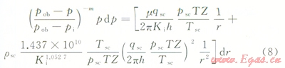式中qsc為標準狀況下氣井產(chǎn)量,104m3/d;h為氣層射開有效厚度,m;`m為平均地層壓力及溫度下氣體的黏度,mPa·s;`Z為平均地層壓力及溫度下氣體的偏差系數(shù);rsc為標準狀況下氣體密度,g/cm3;T為地層溫度,℃;Tsc為標準狀況下溫度,℃;psc為標準狀況下壓力,MPa;pob為儲層上覆壓力,MPa;pi為儲層原始地層壓力,MPa;pe為儲層目前地層壓力,MPa;p為泄油半徑處地層壓力,MPa;pwf為井底流壓,MPa;r為徑向半徑,m;re為泄油半徑,m;rw為井筒半徑,m。