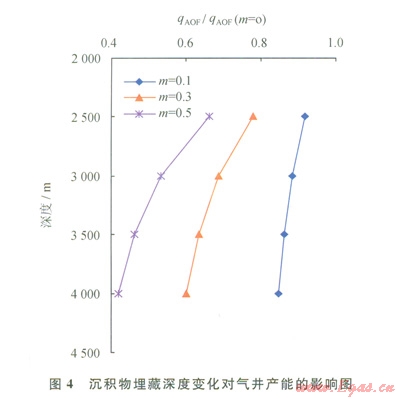 根據(jù)上覆壓力的經(jīng)驗公式:pob=0.01[h水深+2.3(h中深-h水深)],計算出不同儲層埋深下的上覆壓力,再結合式(12)探討上覆壓力對產(chǎn)能的影響(圖4)。從圖4中可以看出:隨著沉積物埋藏深度增加,上覆壓力增大,應力敏感效應越嚴重,氣井產(chǎn)能損失越大。