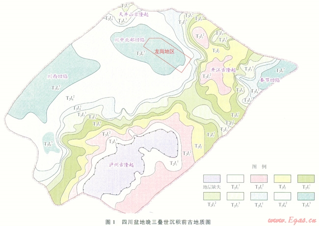 中三疊世末,伴隨著印支運(yùn)動(dòng)的發(fā)生,地臺(tái)整體抬升形成大規(guī)模的海退,上揚(yáng)子地臺(tái)由此結(jié)束了以海相沉積為主的歷史,進(jìn)入以陸相沉積為主的時(shí)期,地層遭受剝蝕。在此過(guò)程巾形成了隆起與凹陷,盆地內(nèi)展現(xiàn)為三隆三凹的格局(圖1)。三隆指南側(cè)瀘州古隆起、北側(cè)開江古隆起以及北西邊緣廣元江油附近的天井山古隆起,三凹是指川西凹陷(包括德陽(yáng)—成都—大邑—邛崍—眉山—雅安地區(qū)和樂(lè)山—犍為地區(qū))、川中北部凹陷(包括蒼溪—閬中—儀隴地區(qū))和川東北的奉節(jié)凹陷。隆起中心地層遭受剝蝕程度大,瀘州古隆起頂部雷口坡組剝蝕殆盡,開江占隆起殘存雷一段,在凹陷內(nèi)剝蝕程度相對(duì)較弱,均保留了雷四段。
