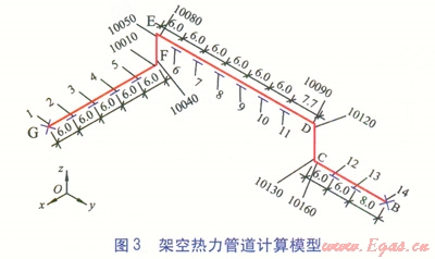 架空供熱管道計算模型見圖3,圖中數(shù)值單位為m。其中節(jié)點1、14為固定支架,節(jié)點2~13為滑動支架,節(jié)點l0010、10040、10050、10080、10090、10120、10130、10160為彎頭應(yīng)力計算節(jié)點。