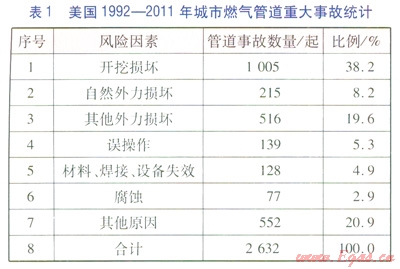 通過分析城市燃氣管道事故統(tǒng)計數(shù)據(jù),將管道面臨的風(fēng)險因素分為7個大類,從管道事故發(fā)生可能性和管道事故后果兩個方面進行分析。以1992—2011年美國的燃氣管道事故數(shù)據(jù)為基礎(chǔ),確定了7類風(fēng)險因素的風(fēng)險等級排序。城市燃氣管道系統(tǒng)風(fēng)險因素的等級排序依次為開挖損壞,其他原因,其他外力損壞,自然外力損壞,誤操作,材料、焊接、設(shè)備失效,腐蝕。詳細分析了7大類風(fēng)險因素在城市燃氣管道日常運行管理中的表現(xiàn)形式,對于制定安全評價方法,提高安全管理水平具有積極意義。