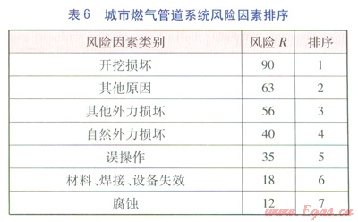 根據(jù)事故發(fā)生的可能性和后果評分結(jié)果,按照式(1)進行計算,城市燃氣管道7類常見風(fēng)險因素排序見表6。
