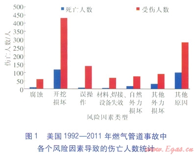 本文中管道事故后果主要從人員傷亡和財產(chǎn)損失兩個方面進行分析。圖1顯示了美國1992—2011年燃氣管道事故中各個風(fēng)險因素導(dǎo)致的傷亡人數(shù)統(tǒng)計,例如,美國1992—2011年城市燃氣管道事故中,開挖損壞共造成了119人死亡和433人受傷,腐蝕類型事故導(dǎo)致了11人死亡和66人受傷。