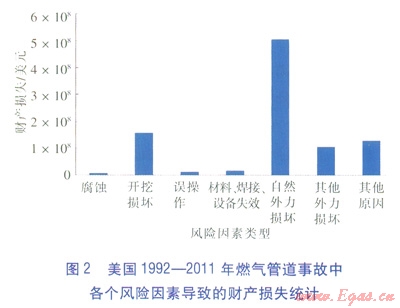 圖2顯示了美國1992—2011年燃氣管道事故中各個風(fēng)險因素導(dǎo)致的財產(chǎn)損失統(tǒng)計,其中,自然外力損壞類事故造成財產(chǎn)損失最多,為5.06×108美元;腐蝕類事故造成的財產(chǎn)損失最小,為914.2×104美元。