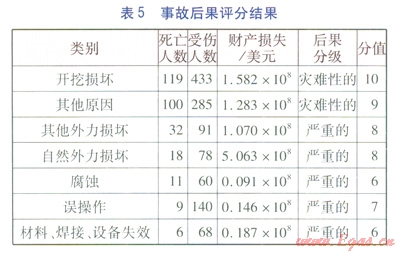 不同類型風(fēng)險因素導(dǎo)致的事故類型也不相同,使得管道事故造成的后果差異也較大。例如,開挖損壞一般對管道破壞較大,會導(dǎo)致氣體大量泄漏,產(chǎn)生火災(zāi)爆炸的可能性較大;而腐蝕類型風(fēng)險一般是腐蝕穿孔,泄漏孑L徑較小,產(chǎn)生的后果也較小。