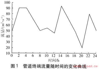 初始條件:初始時(shí)刻(t=0)管道終端(x=L)流量qv(L,0)=50m3/s。邊界條件:管道首端(x=0)壓力p(0,t)=4MPa。管道終端流量隨時(shí)間變化函數(shù)qv(L,t)=f(t),具體見圖1。