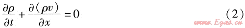 燃?xì)庠诠艿乐械牧鲃?dòng)是不穩(wěn)定流動(dòng),并且可看成一元流動(dòng),流體的壓力、密度、速度等參數(shù)是時(shí)間和管道長(zhǎng)度的函數(shù)。以管道軸線方向?yàn)楦曜鴺?biāo),垂直于管道軸線為z坐標(biāo),可根據(jù)流體力學(xué)知識(shí)建立燃?xì)庠诠艿纼?nèi)流動(dòng)的3個(gè)方程,具體如下[1]: