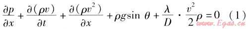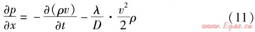 如果單位時(shí)間內(nèi)輸氣量的波動(dòng)較大,就需要考慮動(dòng)量方程中的慣性項(xiàng),上述式(7)、(8)就變成如下形式: