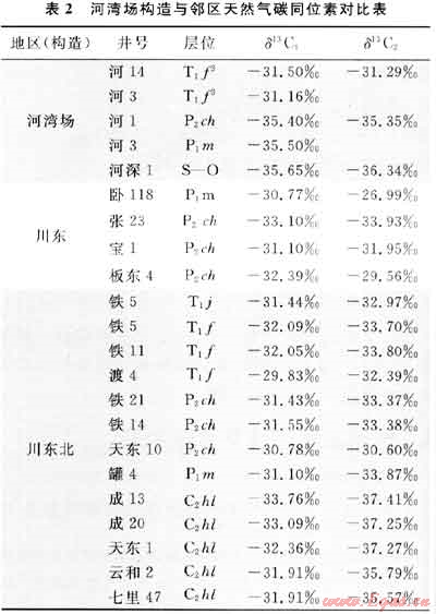 前人研究表明,川西北部地區(qū)下三疊統(tǒng)飛仙關(guān)組烴源條件極差,已歸屬非烴源巖之列,所產(chǎn)天然氣主要?dú)庠磻?yīng)來自下伏烴源巖,且具有混合氣特征。從天然氣碳同位素分析,δ13C1、δ13C2明顯較二疊系天然氣重3.35‰~4.91‰,而地層的實(shí)際埋深卻比二疊系淺600~700m,如果與奧陶系、二疊系天然氣同源的話,根據(jù)天然氣同位素分餾效應(yīng)三疊系碳同位素本應(yīng)比二疊系碳同位素輕才與實(shí)際情況相符。飛仙關(guān)組天然氣表現(xiàn)為δ13C1<δ13C2的正碳同位素系列,但兩者相差不大,其天然氣碳同位素特征與川東寶1井長興組天然氣具有相似的碳同位素組成特征(表2),具有沈平(2005)分類的第三類組成特征及混源特征。前人研究表明,該區(qū)P。砌底部的“王坡頁巖”可能是飛仙關(guān)組的烴源層之一;此外從天然氣乙烷碳同位素看,δ13C2<-28‰,應(yīng)歸屬油型氣范疇,但特征不如二疊系明顯??傊?,飛仙關(guān)組天然氣甲烷碳同位素具煤成氣特點(diǎn),而乙烷碳同位素又具油型氣特征。因此推測河灣場飛仙關(guān)組天然氣可能是二疊系碳酸鹽巖油型氣與上二疊統(tǒng)吳家坪組煤成氣的混合所致。