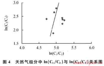 既然河灣場奧陶系、二疊系天然氣與川東石炭系天然氣都來源于志留系烴源巖,為何甲烷碳同位素差異這么大呢?在天然氣生成過程中,存在著2種成因的天然氣,即干酪根裂解氣和原油裂解氣。對于多期成藏的盆地,早期形成的古油藏隨埋深的增大其溫度增高,古油藏中的原油必然要發(fā)生二次裂解而形成天然氣。干酪根裂解和原油裂解形成的天然氣中的C1/C2與C2/C3值完全不同:干酪根裂解所形成的天然氣ln(C1/C2)值變化較大,ln(C2/C3)值變化較??;而原油二次裂解形成的天然氣ln(C1/C2)值變化較小,ln(C2/C3)值變化范圍較大[4~9]。由圖4可見,河灣場氣田的天然氣具有原油二次裂解氣的特征。此外,川西北部地區(qū)經(jīng)歷了古油氣藏的形成及多期成藏過程,且泥盆系-侏羅系儲層中廣泛分布瀝青也說明該區(qū)存在大量原油裂解氣提供了依據(jù)。
