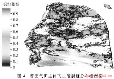 裂縫指數(shù)模型是通過裂縫研究成果(單井裂縫指數(shù))這一指標(biāo),利用序貫指數(shù)計(jì)算方法建立的裂縫分布模型(圖4)。
