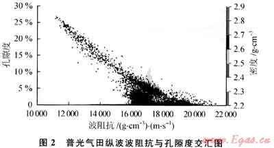 地震資料的優(yōu)勢(shì)在于能夠提供遠(yuǎn)離井點(diǎn)的儲(chǔ)集層信息.但該數(shù)據(jù)體是否能用于約束儲(chǔ)集層參數(shù)建模,還需要進(jìn)一步分析其與儲(chǔ)集層物性參數(shù)的相關(guān)性,只有兩者相關(guān)性好,方可用地震資料反演約束建模。選擇何種地震屬性作為約束條件,以及利用地震數(shù)據(jù)體對(duì)何種儲(chǔ)層參數(shù)做約束是這種建模方法中很重要的一個(gè)環(huán)節(jié)。通過分析認(rèn)為,孔隙度曲線與地震反演波阻抗之間存在良好的負(fù)相關(guān)(圖2),即高孔隙度層段通常都對(duì)應(yīng)于低波阻抗反射波,而低孔隙度層對(duì)應(yīng)于高波阻抗。