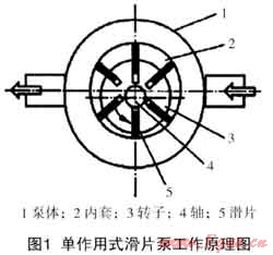 單作用式滑片泵的工作原理如圖1所示[4]。主要由泵體1、內(nèi)套2、轉(zhuǎn)子3、軸4、滑片5、側(cè)板6(未示出)等零件組成。內(nèi)套與轉(zhuǎn)子之間有偏心距e,滑片安放在轉(zhuǎn)子槽內(nèi),可沿槽滑動,當(dāng)轉(zhuǎn)子回轉(zhuǎn)時,滑片靠自身的離心力緊貼內(nèi)套內(nèi)壁,由內(nèi)套內(nèi)表面、轉(zhuǎn)子外表面、滑片及兩側(cè)板端面之間形成若干個封閉工作室,當(dāng)轉(zhuǎn)子逆時針回轉(zhuǎn)時,右邊的滑片逐漸伸出,相鄰兩滑片間容積逐漸增大,形成局部真空,液體由吸入口進(jìn)入工作室,這是泵的吸入過程。左邊的滑片被內(nèi)套逐漸壓入槽內(nèi),相鄰兩滑片間封閉容積逐漸減小,將液體壓出排除口,這是泵的壓出過程。轉(zhuǎn)子轉(zhuǎn)一周,完成一次吸入壓出。在泵的吸入腔和壓出腔之間,有一段封油區(qū),把吸入腔和壓出腔隔開。泵的排量Q與偏心距e、泵的轉(zhuǎn)速n成正比,因此,可采用改變偏心距和轉(zhuǎn)速的辦法調(diào)節(jié)排量或制成系列產(chǎn)品,滿足不同工況的需要。