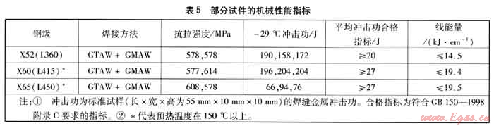 燃?xì)庹{(diào)壓裝置制造公司可根據(jù)自身特點(diǎn),選用國內(nèi)焊接材料,在管線鋼的焊接中采用SMAW+GMAW和GTAW+GMAW,焊后試件各項(xiàng)機(jī)械性能指標(biāo)均達(dá)到規(guī)范要求。焊材和部分試件機(jī)械性能指標(biāo)見表4、5。