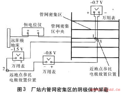 圖3顯示了廠站陰極保護(hù)中管網(wǎng)密集區(qū)的屏蔽現(xiàn)象。1為管網(wǎng)密集區(qū)中央位置,2為遠(yuǎn)地點(diǎn)參比電極放置位置,3為近地點(diǎn)參比電極放置位置?,F(xiàn)場(chǎng)測(cè)量得到,管網(wǎng)密集區(qū)中央相對(duì)于近參比電極的電位即1、3之間的電位差僅為-0.7V,達(dá)不到-0.85V的保護(hù)電位要求;而2、3之間的大地電位差達(dá)到-0.8V,說明電流在土壤中流動(dòng)產(chǎn)生較大的電位梯度,同時(shí)管網(wǎng)密集區(qū)外圍接近保護(hù)要求,說明管網(wǎng)密集區(qū)外圍的管道吸收了大部分保護(hù)電流,導(dǎo)致中央管道得不到足夠的保護(hù)電流,從而造成了屏蔽。