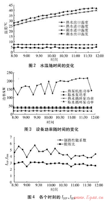 測(cè)試時(shí)間為2011年1月12日至14日,每天8:30—11:50,測(cè)試時(shí)間間隔為10min,確定系統(tǒng)運(yùn)行基本穩(wěn)定后進(jìn)行測(cè)試。測(cè)試數(shù)據(jù)包括:熱泵機(jī)組功率、熱水循環(huán)泵功率、取水泵功率、取水循環(huán)泵功率、熱泵機(jī)組熱水進(jìn)出口溫度和流量、熱泵機(jī)組湖水進(jìn)出口溫度和流量。取水系統(tǒng)原設(shè)計(jì)采用變頻控制,但測(cè)試時(shí)變頻器未最終調(diào)試完成,因此取水系統(tǒng)采用定流量運(yùn)行。熱水循環(huán)系統(tǒng)也采用定流量運(yùn)行。