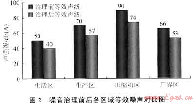 從圖2可以看出,X站壓縮機所產(chǎn)生的噪聲值經(jīng)治理后明顯降低,其中廠界區(qū)和生活區(qū)的噪聲值都在55dB(A)以下,達到了國家3類聲環(huán)境功能區(qū)的夜間排放標準。