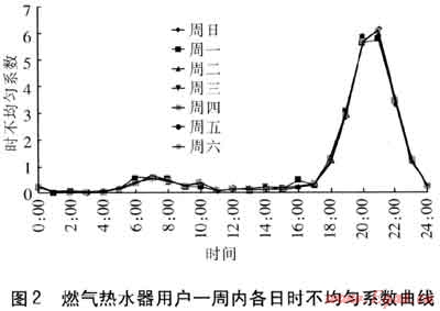 隨著我國(guó)經(jīng)濟(jì)的迅速發(fā)展以及人民生活水平日益提高,人們?cè)谌粘I钪袑?duì)天然氣的需求持續(xù)增長(zhǎng)。天然氣負(fù)荷指標(biāo)和用氣規(guī)律的研究,對(duì)城市燃?xì)庖?guī)劃、設(shè)計(jì)、調(diào)度等具有重要指導(dǎo)意義,近年來受到廣泛關(guān)注[1~16]。筆者于2010年6月至8月對(duì)北京市燃?xì)鉄崴饔脩暨M(jìn)行調(diào)查,由于燃?xì)鉄崴髦饕糜谙丛?,因此在調(diào)查中著重獲取居民夏季一周內(nèi)各日的洗澡時(shí)間、洗澡耗時(shí),并由此計(jì)算燃?xì)鉄崴饔脷饬?,獲得時(shí)不均勻系數(shù)。以一周為變化周期,分析北京市燃?xì)鉄崴鞯挠脷饬考皶r(shí)不均勻性。