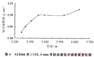 根據各井儲層孔隙壓力情況及安全鉆井密度窗口,選擇密度合適的VERSACLEAN油基鉆井液。以A12Sah井為例,該井儲層段采用密度為0.95g/cm3高油水比油基鉆井液開鉆,隨著現場鉆井過程中屏蔽暫堵材料的不斷補充及鉆屑固相含量的增加,至該井段完鉆時鉆井液密度為0.99g/cm3(圖4)。
